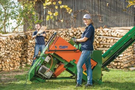 Mocna, wygodna i bezpieczna: ręcznie sterowana piła do produkcji drewna kominkowego firmy Posch wykorzystująca siłę grawitacji.