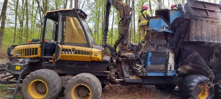 23 listopada 2021r. o godz. 13.00 strażacy OSP Augustowo-Głubczyn otrzymali wezwanie z Powiatowej Komendy Państwowej Straży Pożarnej w Złotowie do palącego się harwestera, który pracował w lesie.