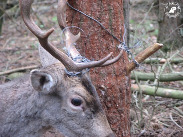 Leśnicy znaleźli młodego daniela, który zaplątał się porożem w drut kłusowniczego wnyku. Miał szczęście - jak mówią przypadkowi ratownicy - że tylko ta część jego ciała została uwięziona. Gdyby pętla zacisnęła się na szyi, zwierzę najprawdopodobniej by się udusiło.