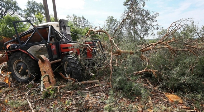 Las w okolicy miejscowości Bogufałów, gmina Przygodzice, nadleśnictwo Taczanów - pień ścinanego drzewa spadł wprost na kabinę ciągnika.