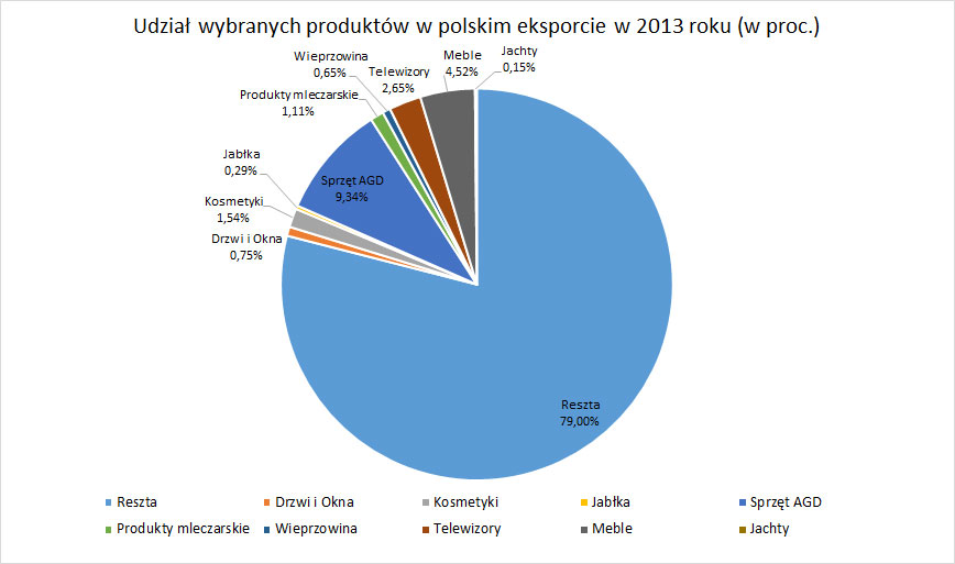 Całkiem nieźle uplasowały się także meble, zajmując ósmą lokatę. 90% mebli wyprodukowanych w Polsce trafia na eksport, co oznacza, że przemysł ten jest nie tylko ważny dla polskiej gospodarki ogółem, ale stanowi kluczowy komponent struktury polskiego eksportu. Dobrym tego przykładem jest fakt, że wartość eksportu polskich mebli w 2013 r. wynosiła więcej, niż całkowity eksport do Włoch (6,57 mld euro). Największym odbiorcą polskich mebli są Niemcy. Polska rozszerza eksport poza Unię Europejską, m.in. na rynki Bliskiego Wschodu. Z sukcesem realizuje już kontrakty do krajów afrykańskich. Pod względem możliwości produkcyjnych nasz kraj zajmuje czwarte miejsce w Europie, wyprzedzają nas Niemcy, Włosi i Wielka Brytania. Natomiast na świecie więcej mebli od nas produkują także Stany Zjednoczone, Chiny i Brazylia.