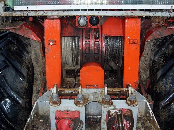 Liczne ogniska korozyjne i silny wyciek oleju leśnej wciągarki bębnowej agregatowanej na ciągniku uniwersalnym dostosowanym do pracy w lesie