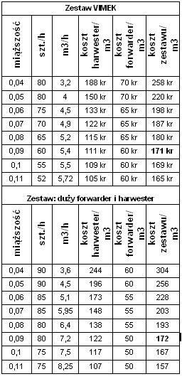 Z zestawienia wynika, że mały zestaw Vimka jest opłacalny w drzewostanach o średniej miąższości drzew do 0,1 m sześc. W drzewostanach starszych, o większej miąższości tańsze jest pozyskanie i zrywka większymi harwesterami i forwarderami.