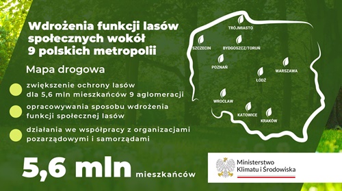 - Powstanie „mapa drogowa” do tworzenia lasów społecznych dla 9 największych aglomeracji w Polsce – Warszawy, Łodzi, Poznania, Wrocławia, Katowic, Krakowa, Trójmiasta, Szczecina, Bydgoszczy/Torunia. W MKiŚ przygotowana zostanie także „mapa drogowa” dla obszarów cennych przyrodniczo.