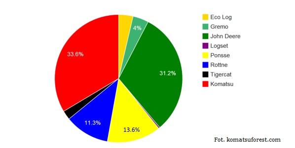 Na wykresie ilustrującym wyniki statystyk przeprowadzonych przez Szwedzką Agencję Transportu, widać że sprzedaż maszyn Komatsu stanowi ponad 33%, na drugim miejscu uplasował się John Deere z wynikiem 31%, a na trzecim marka Ponsse ? ponad 13%.