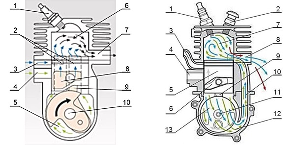 1 ? świeca zapłonowa, 2 ? odprężnik, 3 ? kanał wlotowy czystego powietrza z przepustnicą, 4 ? kanał wlotowy mieszanki paliwowo-powietrznej, 5 ? tłok, 6 ? kanał w powierzchni bocznej tłoka, 7 ? komora spalania w cylindrze, 8 ? kanał wylotowy spalin, 9 ? korbowód, 10 ? wał korbowy z nakładkami, 11 ? kanał przepłukujący, 12 ? skrzynia korbowa