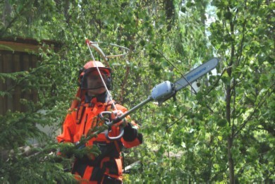 Stelaż podtrzymujący silnik oraz pilarkę na wysięgniku stanowi także osłonę głowy użytkownika przed spadającymi z góry gałęziami.
