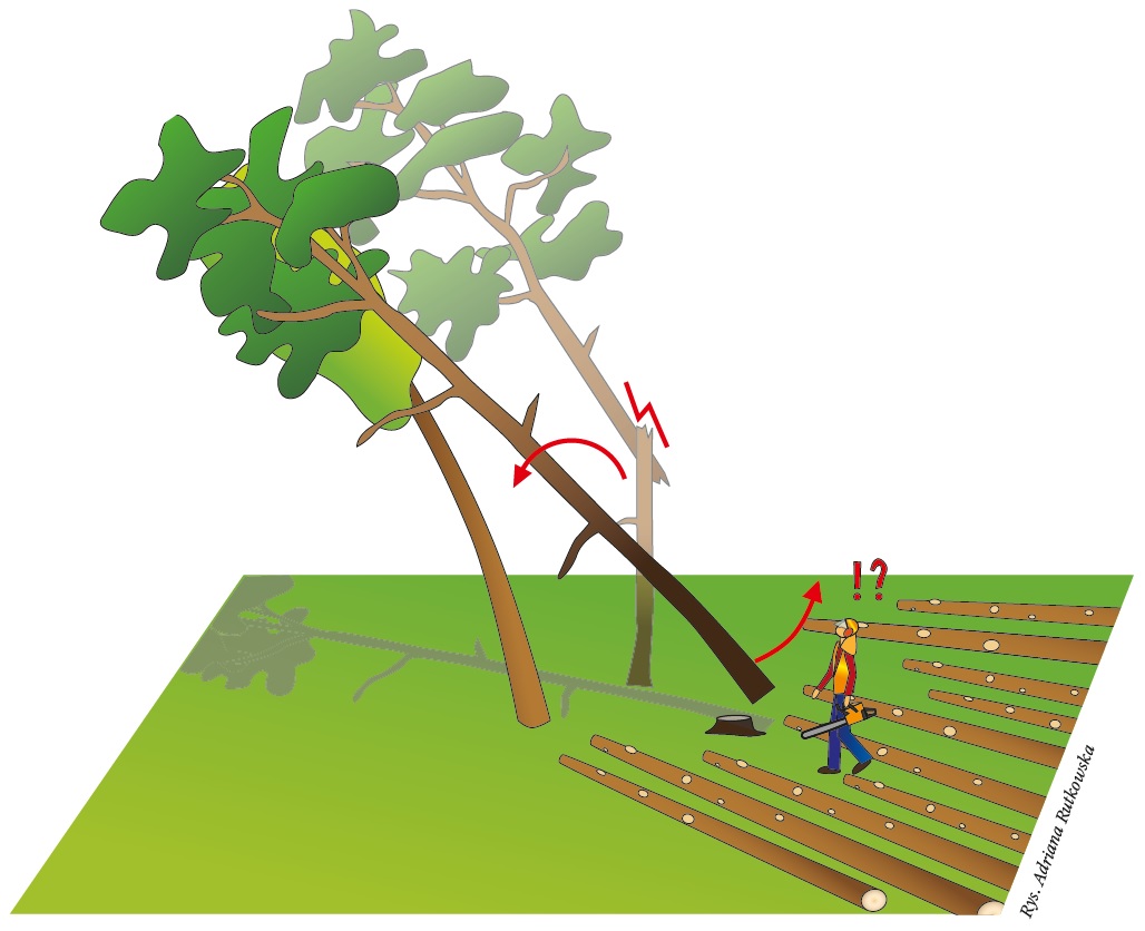 "Praca szła bez większych zakłóceń przez około dwie godziny. Około dziewiątej rano drwal przystąpił do ścinki kolejnego drzewa. Była to sosna wysoka na dwadzieścia kilka metrów o średnicy w miejscu cięcia 48 cm. Stanowisko robocze było nie do końca korzystne. Z obu stron za przyjętym kierunkiem obalania, czyli na teoretycznych ścieżkach oddalania, leżały ułożone w mygły dłużyce. W kierunku obalania zaś, po prawej i po lewej, rosły inne drzewa. Dlatego trzeba było precyzyjnie trafić sztuką w tor zbieżny z kierunkiem położenia dłużyc, by nie spowodować zawieszenia.