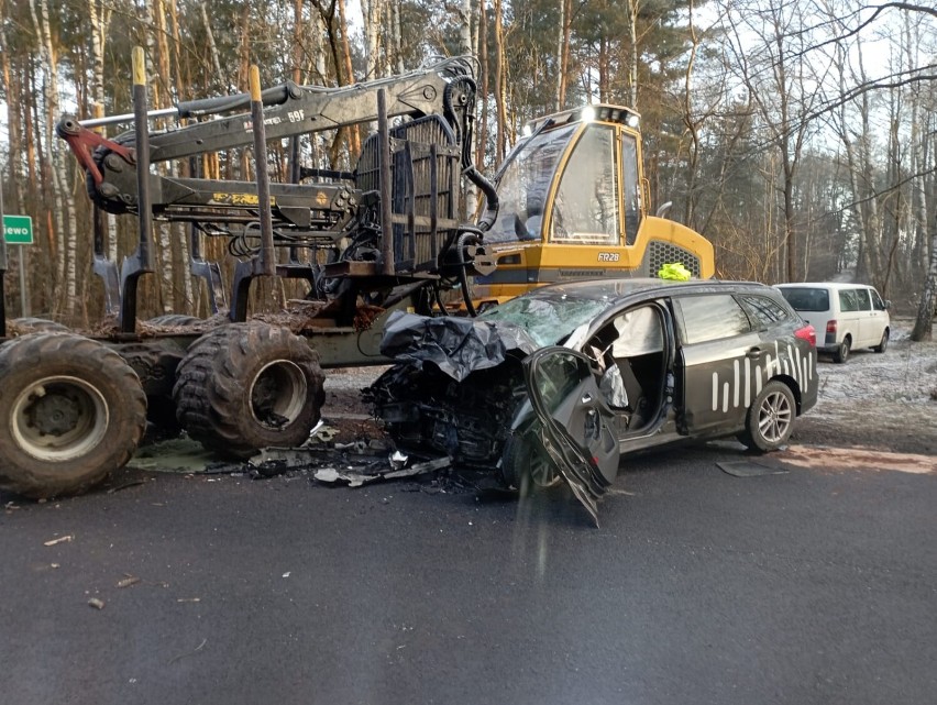 Na drodze krajowej numer 62 doszło do zderzenia samochodu osobowego z maszyną leśną.