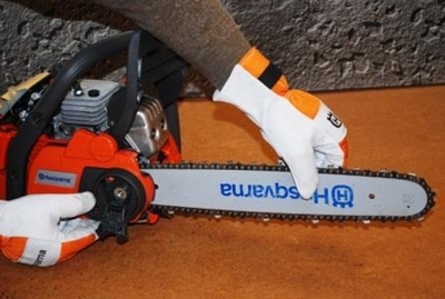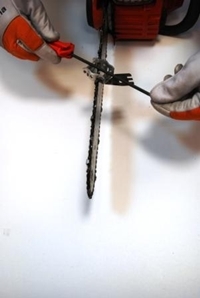 10. Łańcuch musi również posiadać właściwy naciąg. W sytuacji, gdy zwisa staje się bardzo niebezpieczny, a gdy zbyt mocno przylega do prowadnicy, praca pilarką będzie mało wydajna lub w ogóle niemożliwa. Odpowiednio założony łańcuch powinien przylegać do całego obwodu prowadnicy i dać się przesuwać po niej swobodnym ruchem ręki.