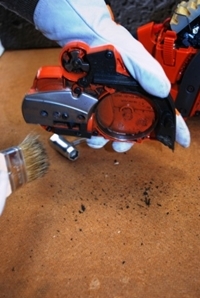 2. W celu sprawdzenia stanu technicznego poszczególnych elementów i ich oczyszczenia, należy zdemontować osłony pilarki. Zdjęcie pokrywy rozrusznika odbywa się poprzez odkręcenie śrub kluczem uniwersalnym. Niezbędnym jest wyczyszczenie szczelin zdjętej osłony oraz łopat wentylatora, na których osadzają się wióry oraz brud. Czynność tę wykonujemy płaskim pędzlem