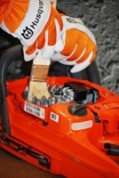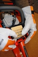 i jego żeber, komory gaźnika, filtru powietrza oraz sprawdzenie stanu technicznego świecy zapłonowej. W tym celu należy zdjąć pokrywę cylindra, którą także czyścimy z obu stron. Filtr powietrza zdejmuje się poprzez zsunięcie mocującej go sprężyny. Lekkie zabrudzenia usuwamy pędzelkiem. W przypadku, gdy filtr jest bardzo brudny, dobrze jest go umyć roztworem płynu do mycia naczyń i ciepłej wody. Niektóre pilarki wyposażone są w systemy wstępnego oczyszczania powietrza, np. Husqvarna opracowała system Air Injection? - wykorzystujący siłę odśrodkową powietrza. Dzięki temu filtr brudzi się znacznie rzadziej.