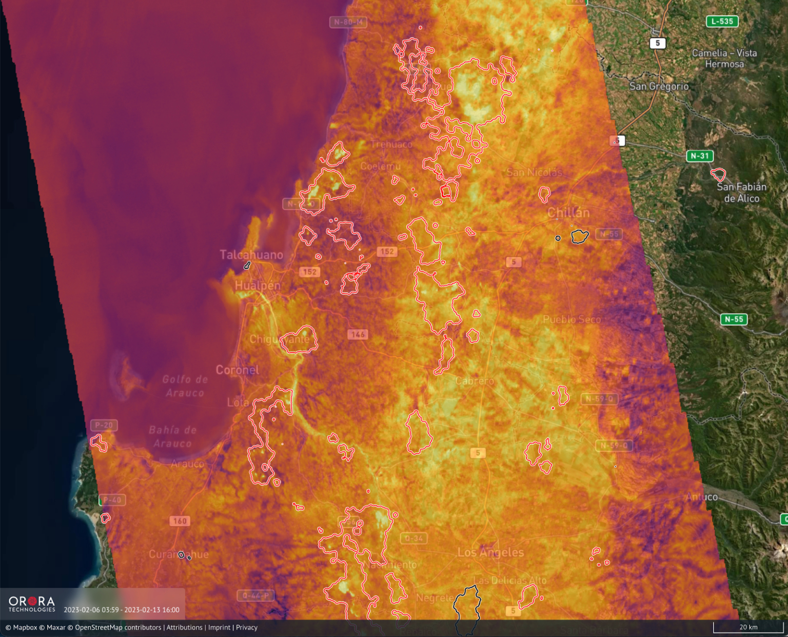 System stworzony przez firmę OroraTech potrafi przewidywać rozwój pożaru na podstawie najświeższych prognoz poogdy, na kolejne parę godzin. Pod uwagę brane są: kierunek i prędkość wiatru, ukształtowanie terenu, wysokość nad poziomem morza i dostępność paliwa.