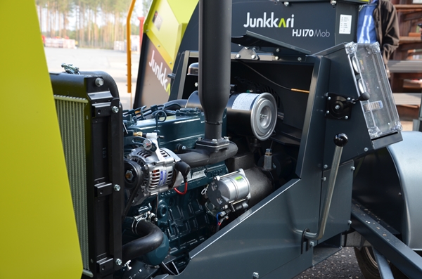 HJ 170 Mob ma własne podwozie i może być łatwo transportowany samochodem z miejsca na miejsce. Napędzany jest silnikiem wysokoprężnym o mocy 35 KM (czterocylindrowy silnik Kubota V1505), ma też własny agregat hydrauliczny do oleju napędowego i rolek podających.