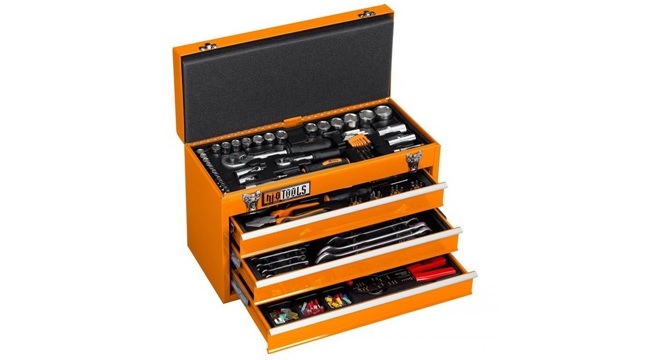 W komplecie znajdziemy narzędzia od śrubokrętów po szczypce, nasadki i grzechotki (dwie grzechotki 1/2" i 1/4", specjalne nasadki 4 ? 32 mm, piętnaście kluczy płaskich 6 ? 22 mm, dwa śrubokręty krzyżakowe, uniwersalny śrubokręt z 24 różnymi, wymiennymi końcówkami, kombinerki 180 mm, nożyce boczne 180 mm, szczypce 200 mm, a także końcówki kabli elektrycznych, szczypce elektryczne, złącza zaciskowe, kable i wiele innych.