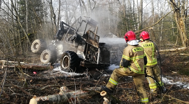 Na miejsce pożaru skierowano dwa pojazdy ratowniczo ? gaśnicze z Państwowej Straży Pożarnej w Braniewie. W chwili dojazdu wymagającymi i trudnymi leśnymi duktami  do miejsca pożaru ogniem objęta była cała maszyna leśna.Strażacy przy wykorzystaniu piany gaśniczej przystąpili do gaszenia palącego się pojazdu.
