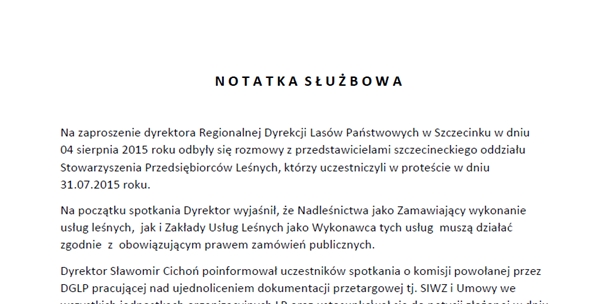 "Strony znacznie zbliżyły swoje stanowiska co do oczekiwań związanych z wykonywaniem usług leśnych na terenie RDLP w Szczecinku" - czytamy w notatce służbowej ze spotkania przedsiębiorców leśnych z RDLP w Szczecinku.