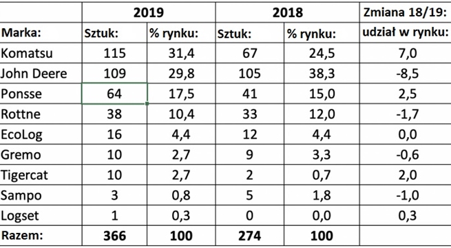 To nie koniec informacji ? szwedzki rynek ma nowego lidera sprzedaży, a została nim firma Komatsu! W zeszłym roku udało się sprzedać 115 czerwonych maszyn, co daje ok. 31,4% udziału w rynku w Szwecji. To niemal o 100% maszyn więcej niż w roku 2018 (67 sztuk). Na drugim miejscu uplasowała się marka John Deere ze 109 maszynami (29,8% udziału w rynku, 105 szt. w 2018 r.), a na trzecim Ponsse ? 64 forwardery (17,5% rynku, 41 szt. w 2018 r.). Kolejne miejsca to Rottne (38 szt.), EcoLog (16 szt.), Gremo (10 szt.), Tigercat (10 szt.), Sampo (3 szt.), Logset (1 szt.).