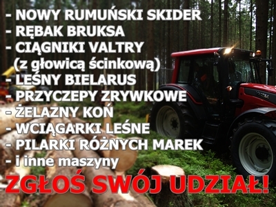Pokaz pracy w lesie: nowy rumuński skider, ciągniki leśne Valtry (z głowicą ścinkową) i Belarus, ciągniki Kubota, potężny rębak Bruksa, żelazny koń, przyczepy zrywkowe z żurawiem, wciągarki leśne, pilarki różnych marek, opony leśne i inny sprzęt leśny.