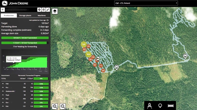 Dane zebrane przez czujniki harwestera i dokładna lokalizacja ściętego pnia ustalana w oparciu o sygnał GPS są automatycznie przesyłane do aplikacji TimberMatic Maps używanego przez zrywkarza w forwarderze. Dane między maszynami są aktualizowane non?stop, za pośrednictwem usługi udostępniania informacji w chmurze, a wszyscy operatorzy pracujący na tej samej powierzchni roboczej mogą zobaczyć wszystkie gatunki pozyskiwanych drzew i konkretne pakiety sortymentów ze szlakami technologicznymi włącznie i masą surowca.