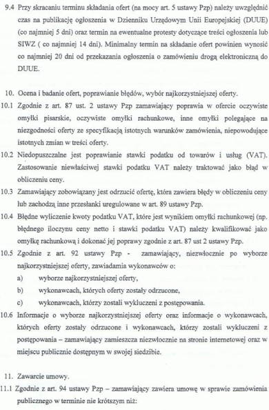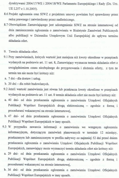 9.4 Przy skracaniu terminu składania ofert (na mocy art. 5 ustawy Pzp) należy uwzględnić czas na publikację ogłoszenia w Dzienniku Urzędowym Unii Europejskiej (DUUE) (co najmniej 5 dni) oraz termin na ewentualne protesty dotyczące treści ogłoszenia lub SIWZ (co najmniej 14 dni). Minimalny termin na składanie ofert powinien wynosić co najmniej 20 dni od przekazania ogłoszenia o zamówieniu drogą elektroniczną do DUUE.