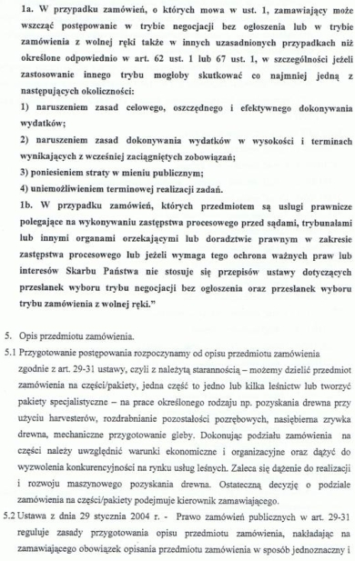 5.1 Przygotowanie postępowania rozpoczynamy od opisu przedmiotu zamówienia zgodnie z art. 29?31 ustawy, czyli z należytą starannością ?możemy dzielić przedmiot zamówienia na części/pakiety, jedna część to jedno lub kilka leśnictw lub tworzyć pakiety specjalistyczne ? na prace określonego rodzaju np. pozyskania drewna przy użyciu harwesterów, rozdrabnianie pozostałości pozrębowych, nasiębierna zrywka drewna, mechaniczne przygotowanie gleby. Dokonując podziału zamówienia na części należy uwzględnić warunki ekonomiczne i organizacyjne oraz dążyć do wyzwolenia konkurencyjności na rynku usług leśnych. Zaleca się dążenie do realizacji i rozwoju maszynowego pozyskania drewna. Ostateczną decyzję o podziale zamówienia na części/pakiety podejmuje kierownik zamawiającego.