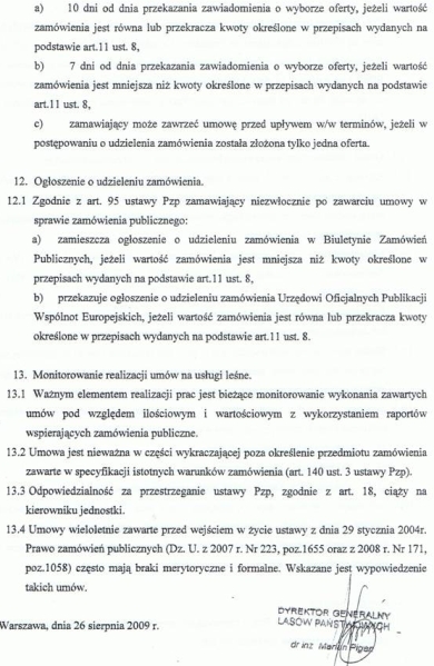 8.4 Urzędowi Oficjalnych Publikacji Wspólnot Europejskich przekazuje się głoszenia dotyczące zamówień na usługi leśne, których wartość jest równa lub przekracza wyrażoną w złotych równowartość kwoty 133 000 euro ?rozporządzenie Prezesa Rady Ministrów z dnia 19 grudnia 2007 r. w sprawie kwot wartości zamówień oraz konkursów, od których jest uzależniony obowiązek przekazywania ogłoszeń Urzędowi Oficjalnych Publikacji Wspólnot Europejskich (Dz. U. Nr 241, poz. 1762).