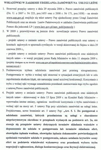1. Stosować przepisy ustawy z dnia 29 stycznia 2004 r. Prawo zamówień publicznych (Dz. U. z 2007 r. Nr 223, poz.1655 oraz z 2008 r. Nr 171, poz.1058) ? na stronie www.uzp.gov.pl znajduje się tekst ustawy Pzp ujednolicony przez Urząd Zamówień Publicznych oraz na stronie Lasów Państwowych w zakładce Zamówienia publiczne/Pomoc dla jednostek LP (www.lp.gov.pl/zam_publ/pomoclp )