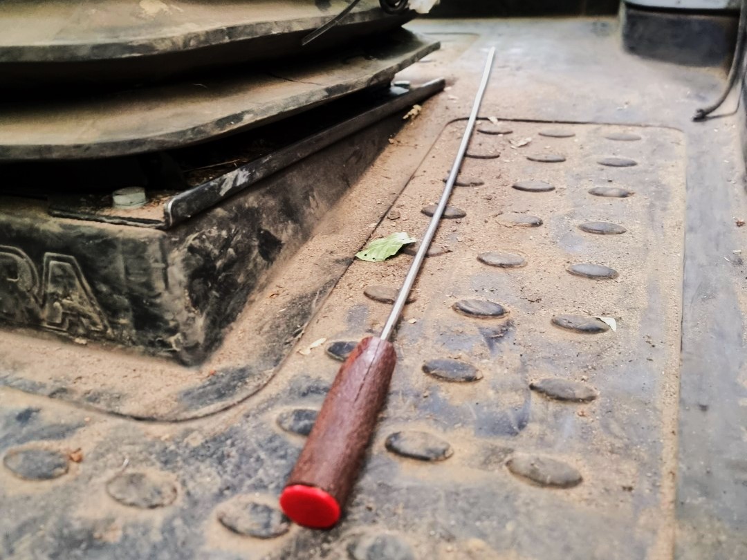 I nagle grzybiarz z tej bambusowej laski wyciągnął… pokaźnej długości szpikulec. Jak się potem okazało miał on ok. 70 cm długości.