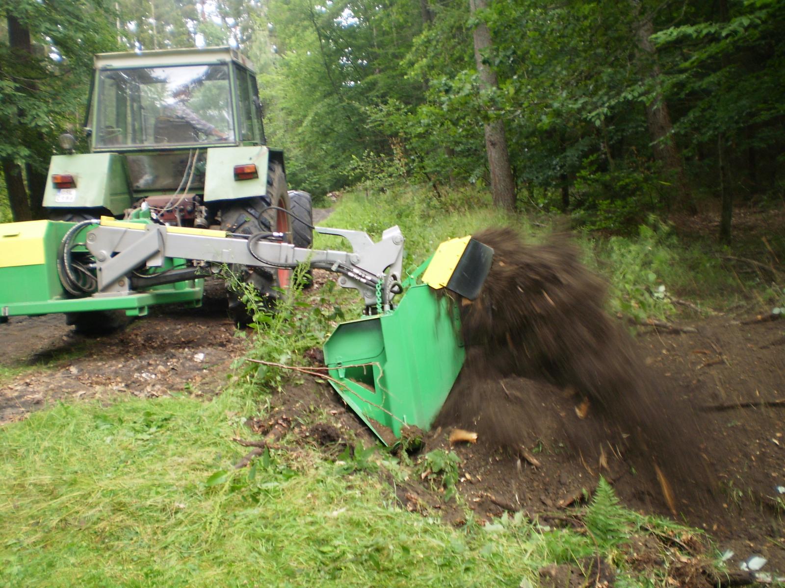 Pługofrez PR-H2 ? pługofrez posiada obracaną głowicę roboczą, która umożliwia wyrzut urobku z konserwowanego rowu ?do lasu? lub ?na drogę?. Urządzenie przeznaczone jest do odnawiania, pogłębiania istniejących  rowów melioracyjnych. Posiada głowicę roboczą zawieszony na wysięgniku sterowanym hydraulicznie i pozwala na pracę w odległości do 2,5 m od osi ciągnika oraz na głębokości ok 1m od poziomu drogi.